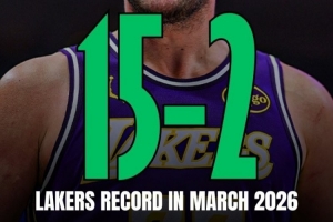整个三月份(当地时间),湖人一共打了17场比赛,战绩15胜2负。