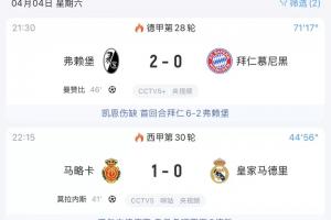 今天的联赛比赛,拜仁现在正0-2落后弗赖堡,而皇马则0-1落后马略卡。