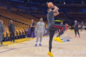 赛前,杜兰特进行热身,看来膝盖伤势并不严重。