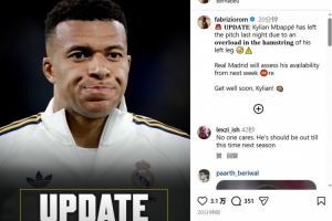 今日转会专家罗马诺在社交媒体更新了姆巴佩的情况,他这样写道:“更新:姆巴佩昨晚因左腿腿筋负荷过度离场,皇马将评估他下周是否可以出战。”
