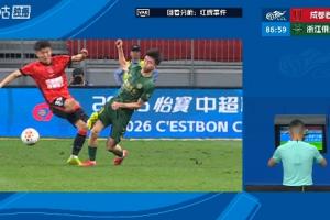 体育资讯04月25日讯 中超第8轮,成都蓉城主场迎战浙江。第86分钟,甘超踹到王钰栋大腿,VAR介入后,裁判将甘超红牌罚下。