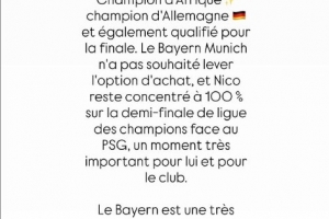 “他是非洲冠军、德甲冠军,并且同样获得了进入决赛的资格(德国杯)。拜仁慕尼黑目前并无意愿执行买断条款,但尼科(杰克逊)本人正100%专注于对阵巴黎圣日耳曼的欧冠半决赛,这对球员及其俱乐部而言都是极其重要的时刻。”