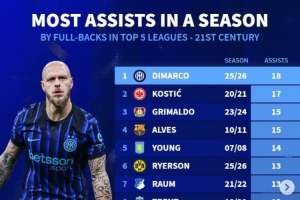 体育资讯4月28日讯 德转统计五大联赛本世纪边后卫单赛季助攻次数排行榜,迪马尔科25/26赛季18次居首,阿诺德、阿尔维斯、科斯蒂奇两度上榜。