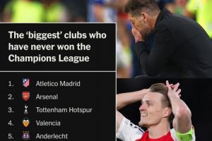 赛前The Athletic评出了从未夺得欧冠的球队排行榜,3次夺得欧冠亚军的马竞和一次夺得亚军的阿森纳分别占据前二。