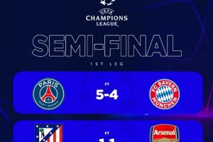 体育资讯04月30日讯 欧冠半决赛首回合结束,巴黎5-4拜仁,阿森纳客场1-1战平马竞。